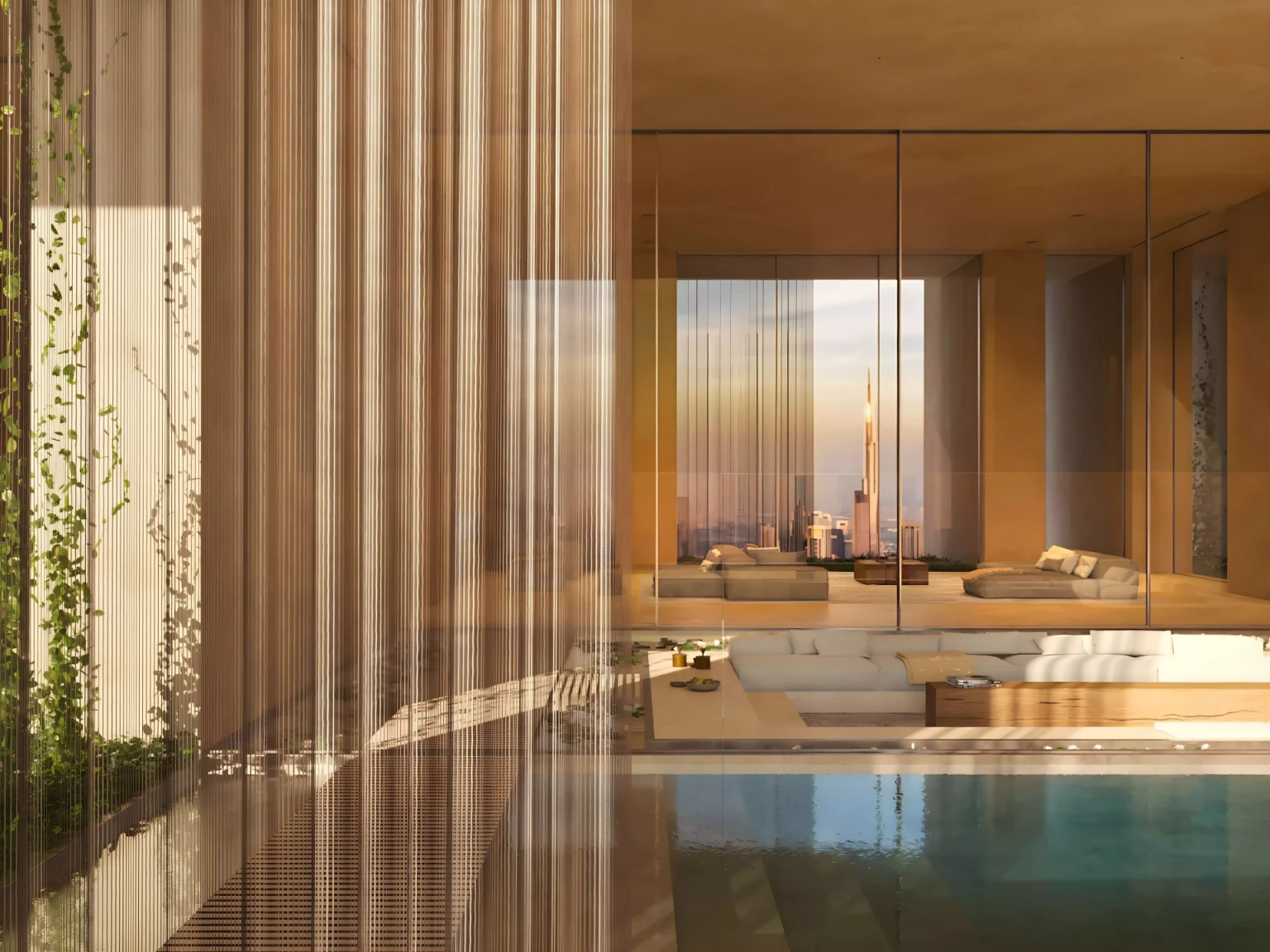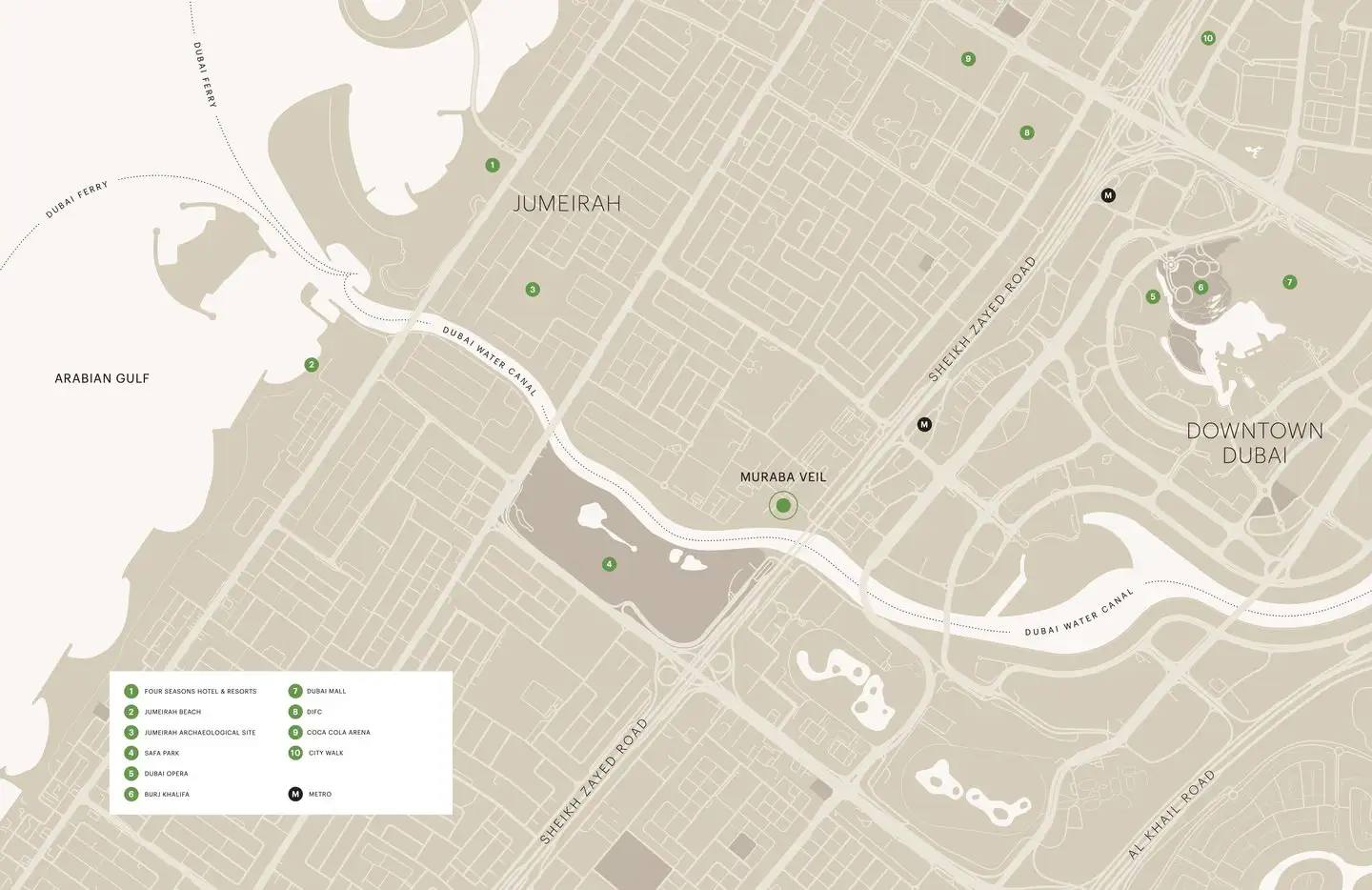 Muraba Veil is a striking new landmark in Al Wasl, Jumeirah, rising 1,247 ft along the Dubai Water Canal. Inspired by desert forms and Arabian traditions, it offers modern, calm, and beautifully balanced living. With courtyard-influenced interiors, dual-aspect rooms, and spacious terraces, residents enjoy natural airflow, serenity, and an eco-connected lifestyle.